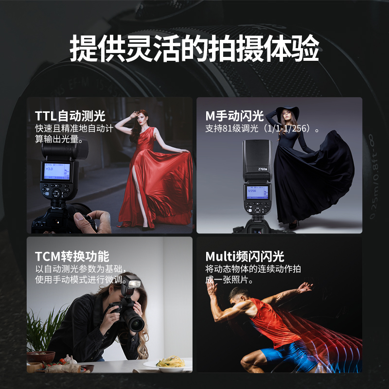 ● 支持TTL/M/Multi/S1/S2多种模式,具有闪光曝光补偿功能