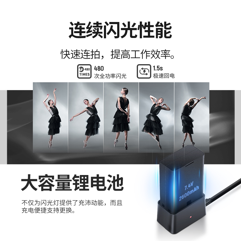 ● 2600mAh大容量锂电池,提供480次全功率闪光
