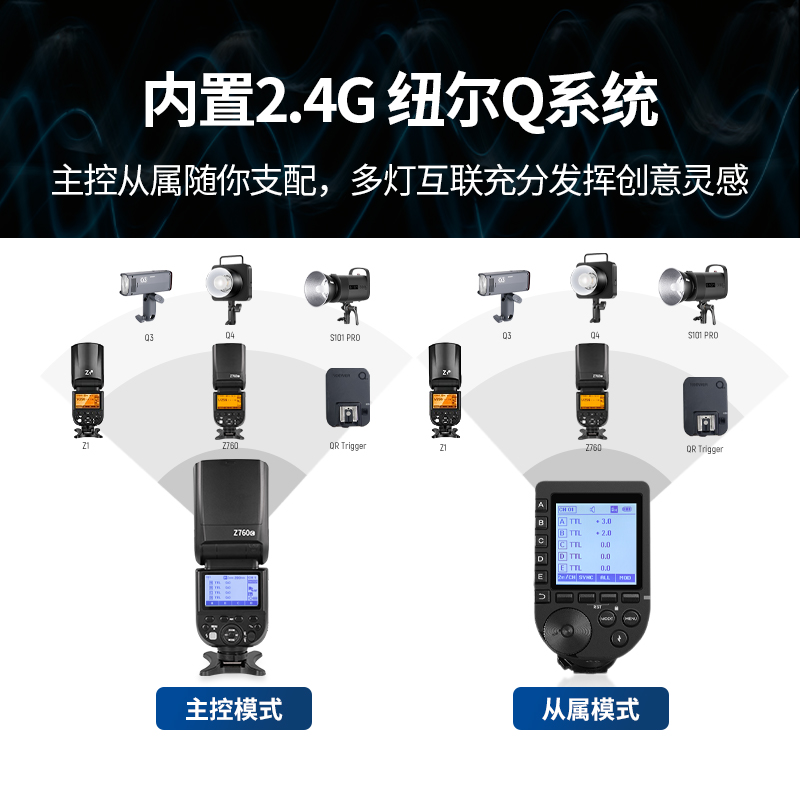 ● 内置NEEWER 2.4G无线Q系统,可作为主控或从属单元